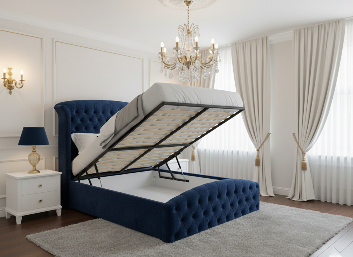Transform your bedroom into a sanctuary of style and organization. Our Royal Navy Blue Velvet Bed combines the timeless elegance of a deep-tufted Chesterfield design with the modern necessity of hidden storage. Wrapped in a premium, high-sheen plush velvet, the oversized wingback headboard creates a dramatic focal point, while the matching tufted footboard completes the high-end look.