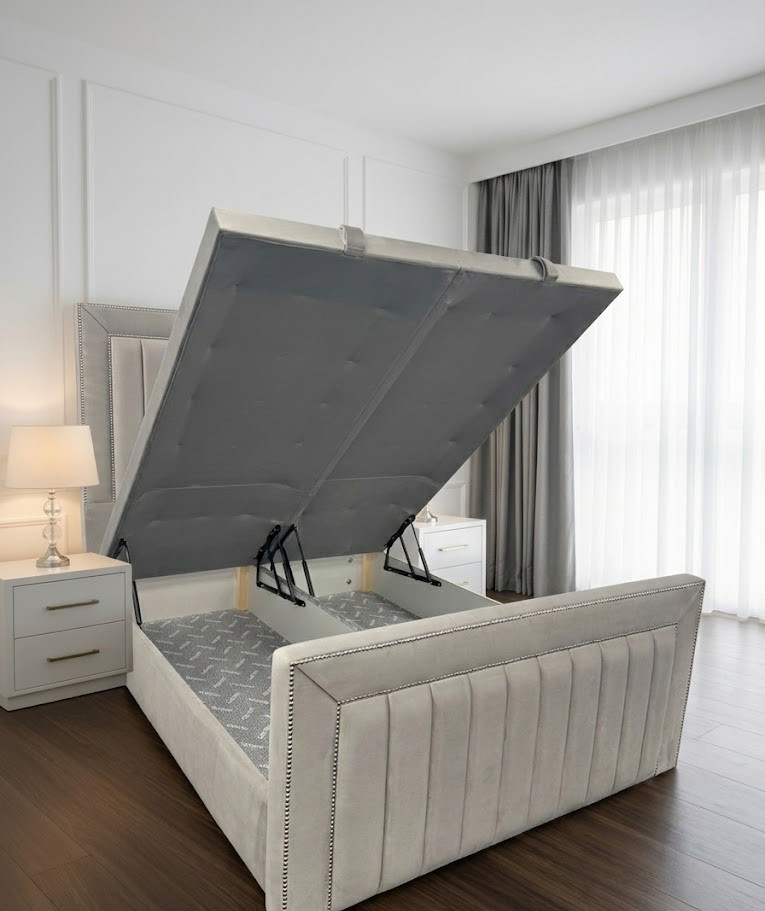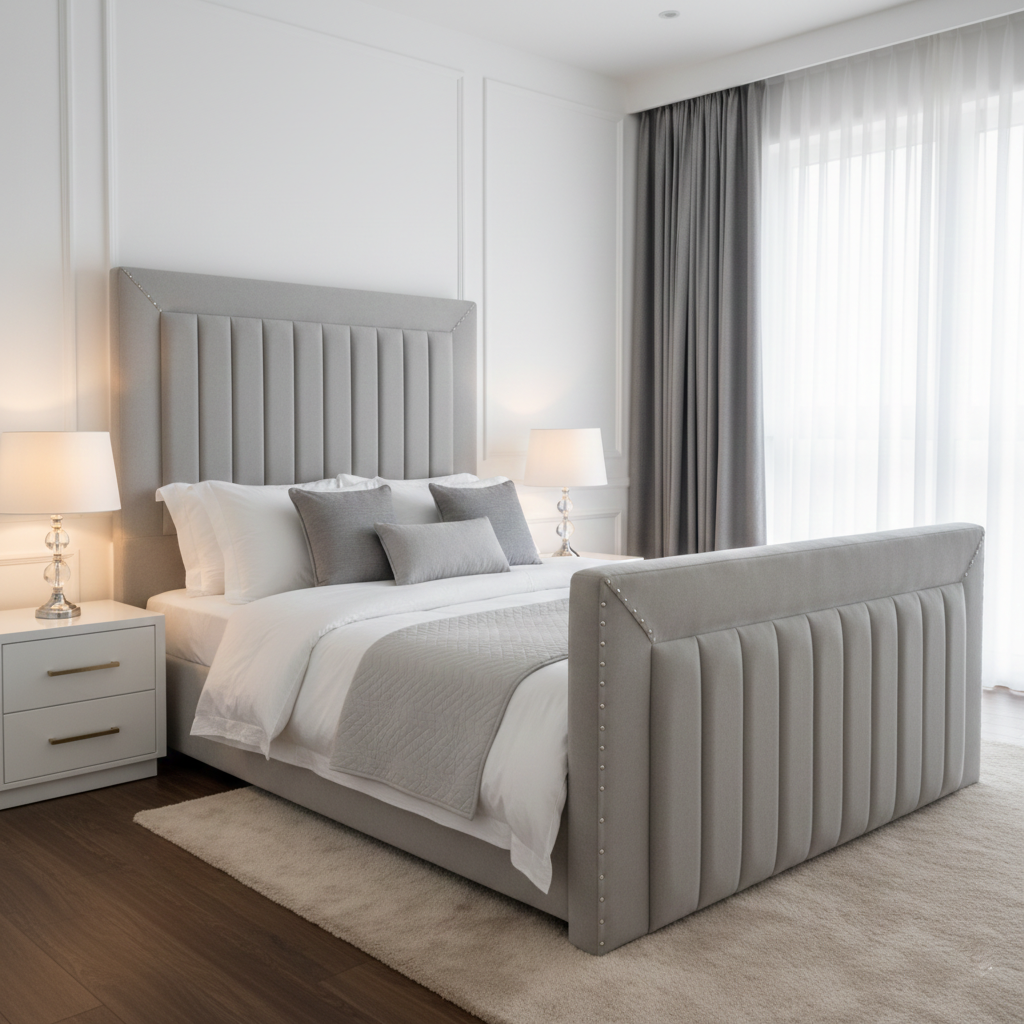 Transform your bedroom into a 2026 sanctuary with the Line Down Bed. This masterpiece combines the timeless elegance of Art Deco influences with modern functionality, featuring a strikingly tall headboard with vertical channel tufting and hand-applied chrome-tone nailhead trim.