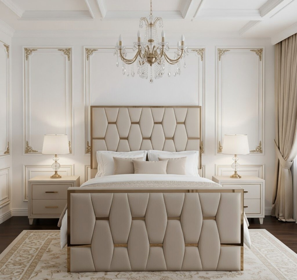 Signature Gold Detailing: Hand-finished metallic strips embedded in the headboard and footboard for a modern, high-end aesthetic.